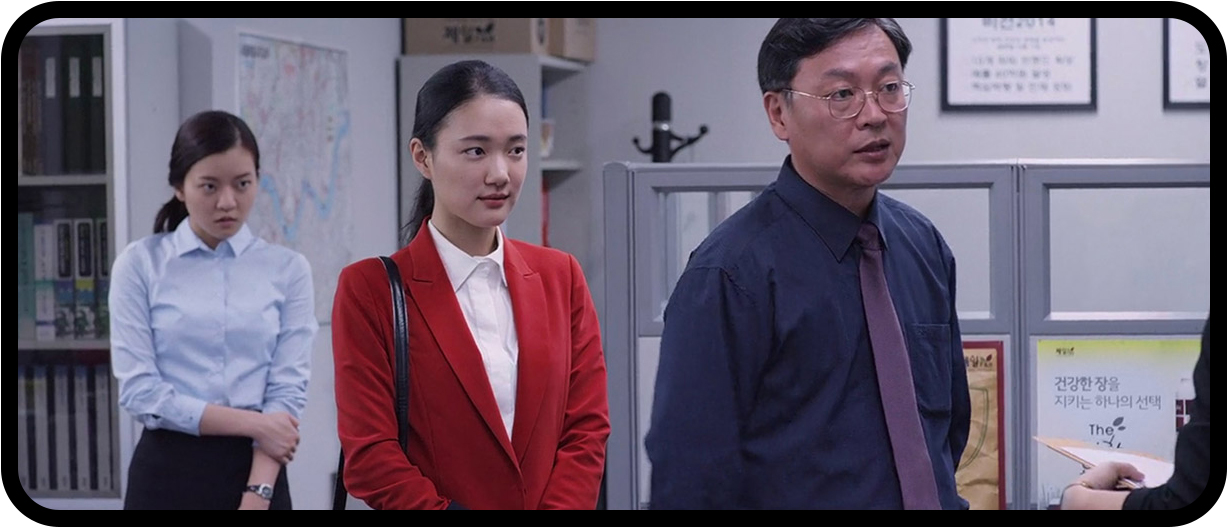 Mi-Rye has no power to speak up when she’s being bullied by the others in the office. When Detective Jong-Hoon approaches her about Kim, she is locked in a room and pressured by another man to lie about her working environment.